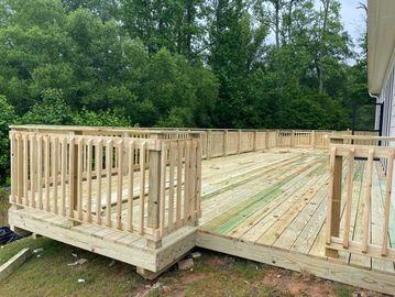 This deck is a wraparound deck, in a stained finished color.